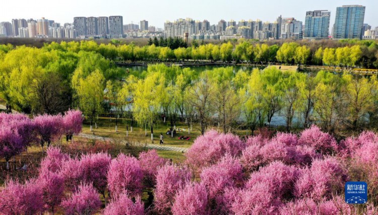 西安大明宫国家遗址公园内的美人梅连片盛开(3月14日摄,无人机照片)。