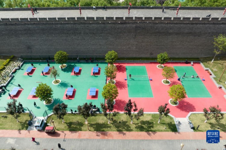 4月25日,市民游客在西安城墙北段外的公园内运动休闲(无人机照片)。