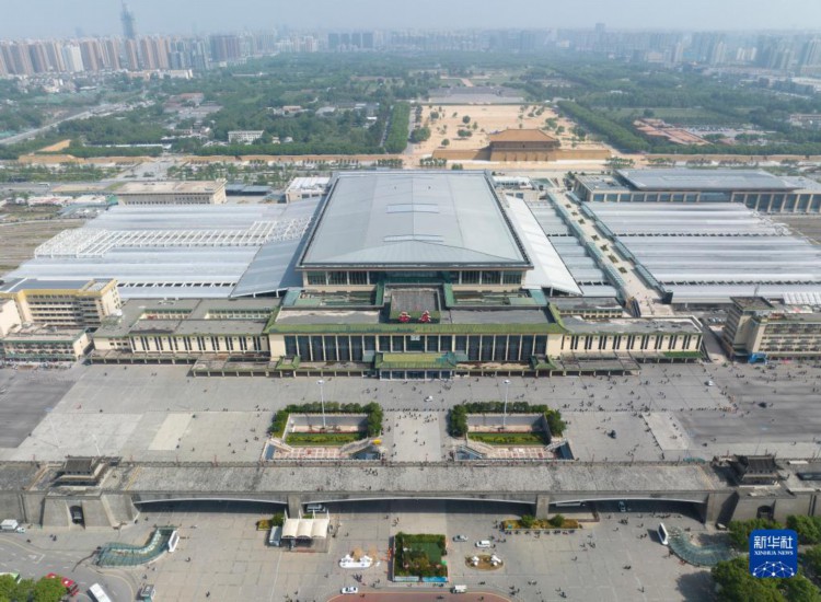 西安火车站与其身后的大明宫国家遗址公园(4月25日摄,无人机照片)。