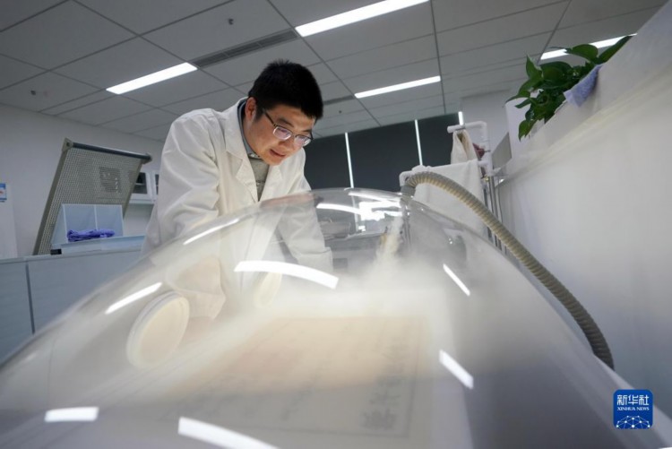 4月28日,在上海市档案馆的保护技术部,档案修复师任翘楚利用专业设备对档案进行展平处理。