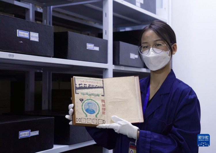 4月28日,在上海市档案馆的珍档库房,保管部工作人员赵竞舸展示馆藏珍档《青年杂志》创刊号。 近年来, 在上海市档案馆,“80后”“90后”青年档案人才活跃在档案保管、档案修复、展陈策划、查档接待、档案数字化转型等领域。他们埋头“故纸堆”,从一张张地契、一本本史书、一张张旧照片中搜寻、整理、展示上海的“城市记忆”。 新华社记者 刘颖 摄