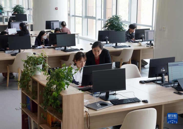 4月28日,在上海市档案馆的公众查档区,接待人员王琳元(中间站立者)在帮助市民查档。 近年来, 在上海市档案馆,“80后”“90后”青年档案人才活跃在档案保管、档案修复、展陈策划、查档接待、档案数字化转型等领域。他们埋头“故纸堆”,从一张张地契、一本本史书、一张张旧照片中搜寻、整理、展示上海的“城市记忆”。 新华社记者 刘颖 摄