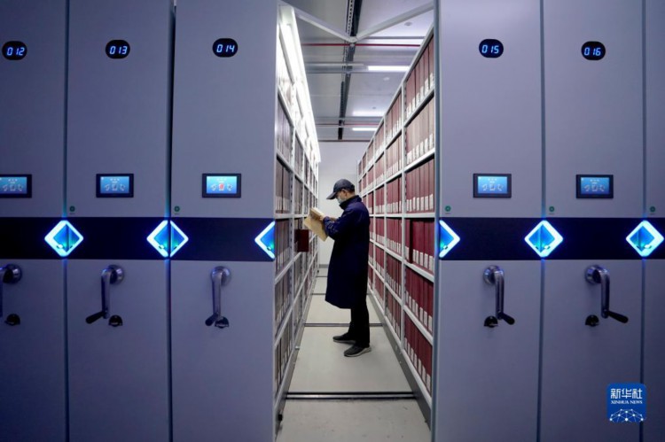 4月28日,在上海市档案馆的库房内,保管部工作人员杜新庆在智能密集架间提取档案。 近年来, 在上海市档案馆,“80后”“90后”青年档案人才活跃在档案保管、档案修复、展陈策划、查档接待、档案数字化转型等领域。他们埋头“故纸堆”,从一张张地契、一本本史书、一张张旧照片中搜寻、整理、展示上海的“城市记忆”。 新华社记者 刘颖 摄