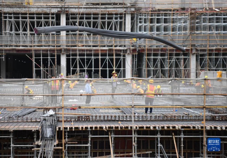 5月5日,在广州黄埔区的中山大学附属第三医院岭南医院二期项目,工人在指挥吊运钢筋。