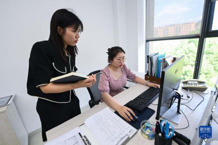 5月5日,诸暨市财政部门工作人员(左)在电脑前指导符合规定的外贸企业线上申请财政补助。