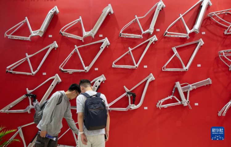 5月5日,在第31届中国国际自行车展览会上,观众参观车架。