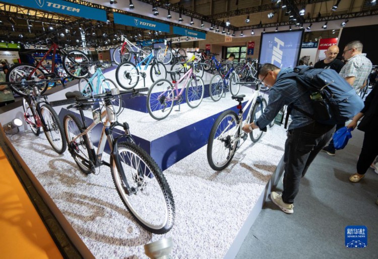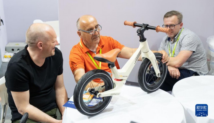 5月5日,在第31届中国国际自行车展览会上,波兰客商在观看童车。