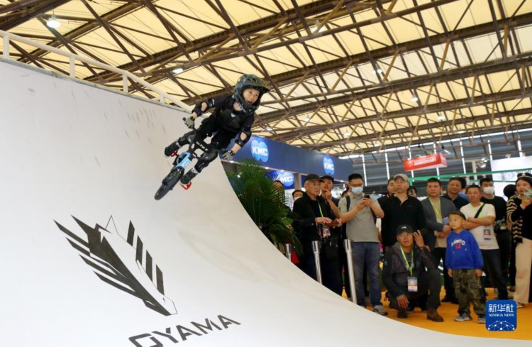 5月5日,一位小骑手在第31届中国国际自行车展览会现场进行自行车“U”形道特技表演。