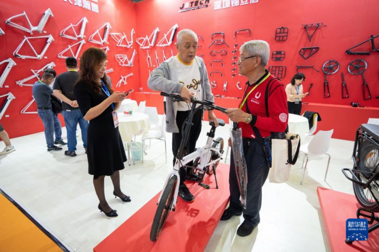 5月5日,在第31届中国国际自行车展览会上,观众观看折叠自行车。