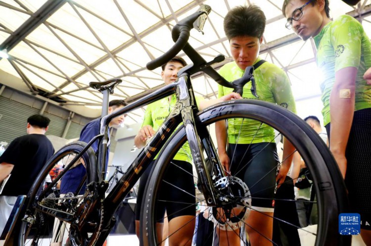 5月5日,在第31届中国国际自行车展览会上,观众参观车架。