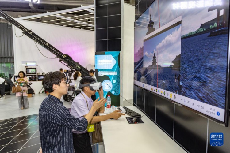 5月5日,在中国影视科技创新成果展上,嘉宾利用VR设备体验元宇宙场景。