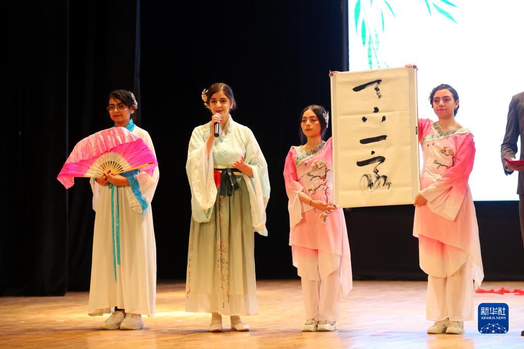 5月8日,参赛者(左二)在埃及伊斯梅利亚省的苏伊士运河大学举办的“汉语桥”世界大学生中文比赛埃及赛区决赛上展示书法。新华社记者隋先凯摄