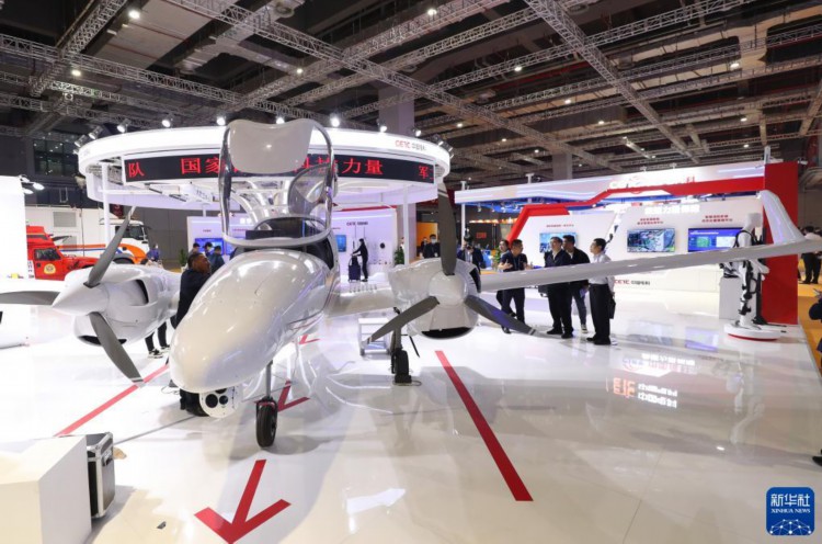 5月8日,工作人员在一架空中应急指挥机旁向参观者做介绍。