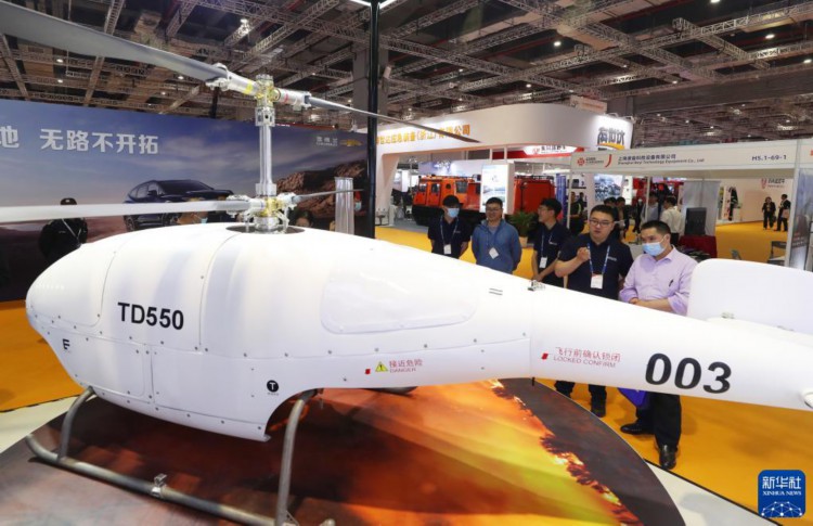5月8日,参观者在一架大载重应急救援无人机旁交流。 当日,以“推进高水平安全 护航高质量发展”为主题的第二届长三角国际应急减灾和救援博览会在国家会展中心(上海)开幕。作为“长三角地区5·12防灾减灾宣传周”活动之一,博览会围绕应急管理、灾害普查、智慧消防、应急救援、智慧城市等内容,聚焦“全灾种、大应急”,通过展览、会议和论坛科普等多种形式,推动安全应急产业融合发展和转型升级。 新华社记者 方喆 摄