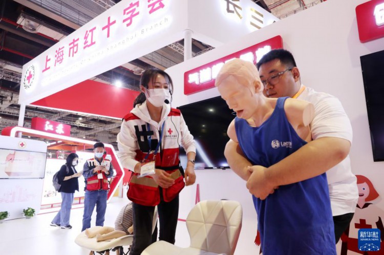 5月8日,一位参观者在工作人员指导下体验气道梗阻应急救援操作。