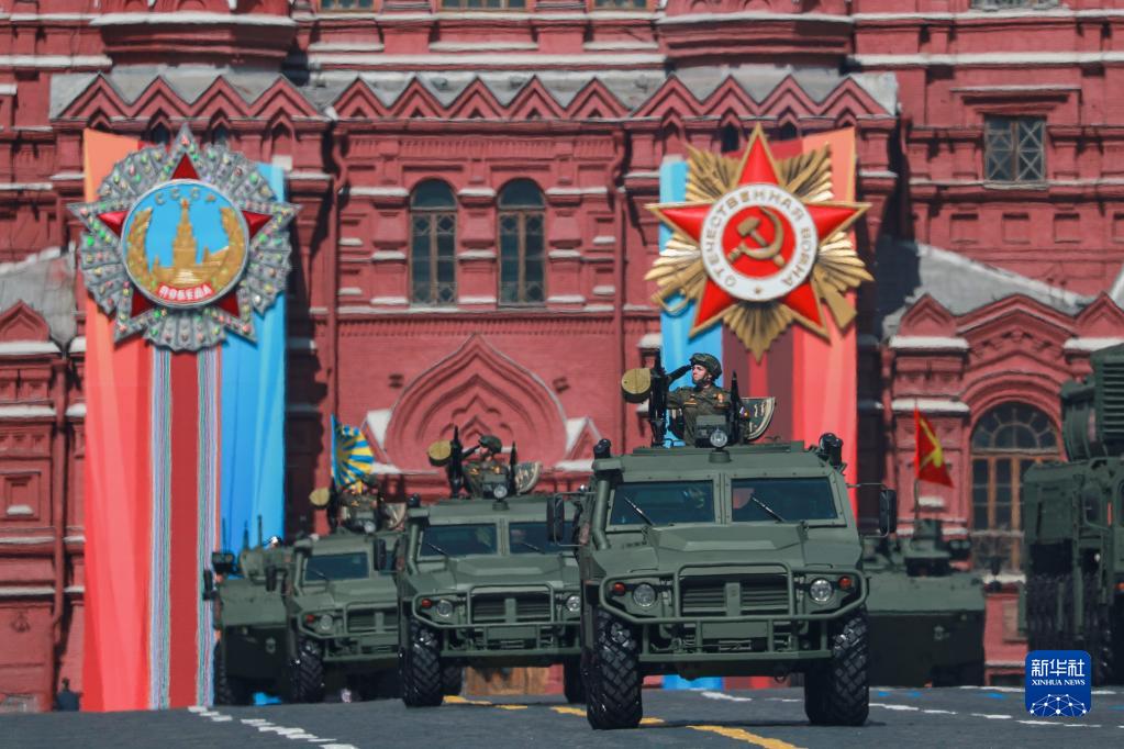 5月9日,在俄罗斯首都莫斯科,军车编队驶过红场。新华社记者 曹阳 摄