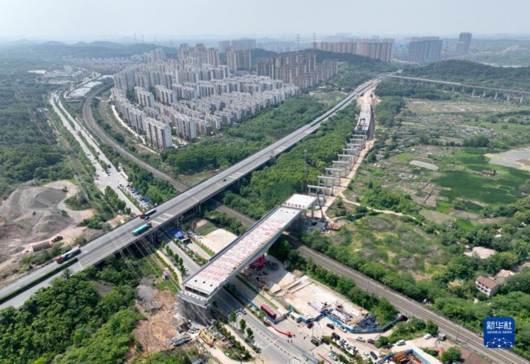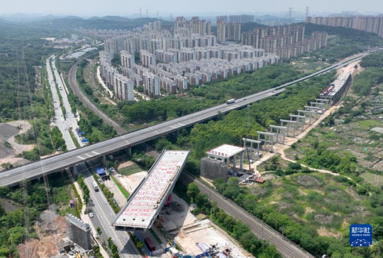 5月9日,转体桥在转体前(无人机照片)。 当日,转体重量14000余吨的武汉绕城高速改扩建转体桥成功转体,在100分钟内顺时针旋转71度,跨越武九铁路和森林大道公铁大动脉。 为实现有效平衡转体,施工单位中铁十一局用300吨配重使桥梁具备较好的平衡性,达到理想的转体条件,并采用精准控制手段,在规定的时间内完成转体,最大程度减小对武九铁路运营的影响。 新华社记者 程敏 摄