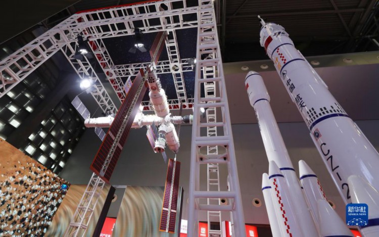 5月10日,这是在博览会创新100+展区内中国航天展台展出的中国空间站1:10模型和长征系列火箭模型展品。 当日,2023年中国品牌博览会在上海世博展览馆拉开帷幕。在近6万平方米的上海世博展览馆内,围绕活动主题设置主题展区、综合展区和专题展区,1000家左右的品牌企业汇聚一堂,向世界传递中国品牌新势能。 新华社记者 方喆 摄