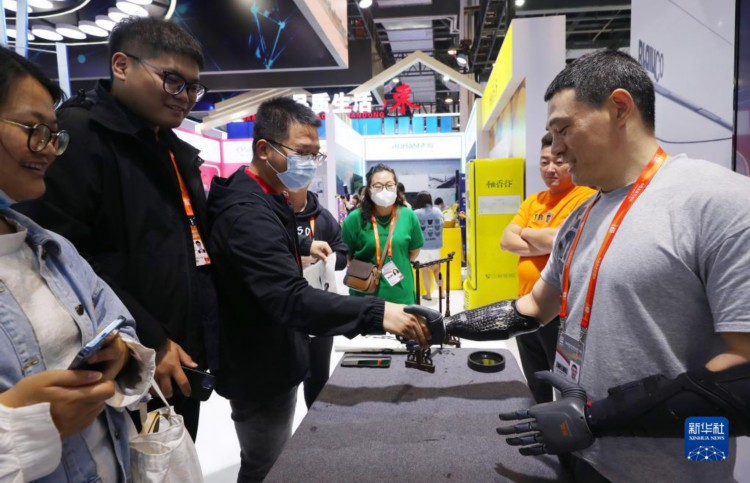 5月10日,在浙江省品牌推介展台上,参观者与安装脑机科技操控假肢的工作人员握手。 当日,2023年中国品牌博览会在上海世博展览馆拉开帷幕。在近6万平方米的上海世博展览馆内,围绕活动主题设置主题展区、综合展区和专题展区,1000家左右的品牌企业汇聚一堂,向世界传递中国品牌新势能。 新华社记者 方喆 摄 |