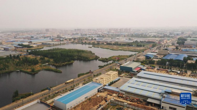 5月11日拍摄的河北省文安县左各庄镇人造板制造服务创新示范区一角(无人机照片)。