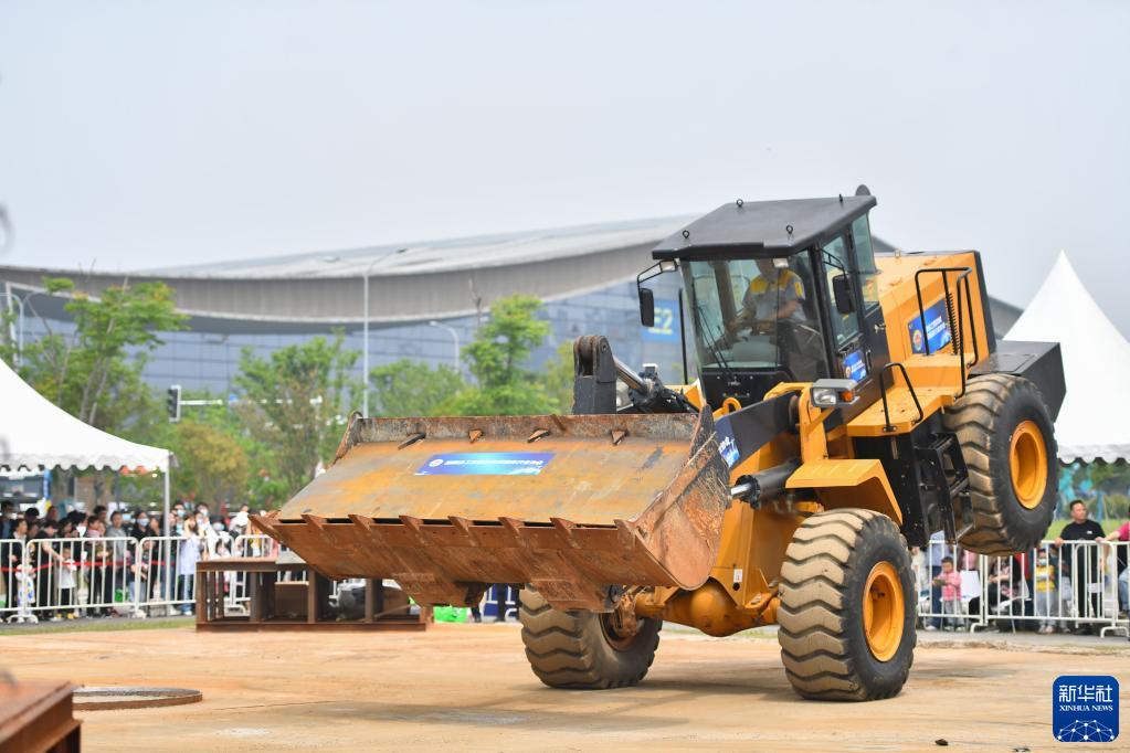 5月13日,在长沙国际工程机械展览会上,机手驾驶装载机表演。 在湖南长沙举办的第三届长沙国际工程机械展览会上,机手们驾驶挖掘机和装载机进行整机漂移、“空中漫步”等,并摆出各种造型、秀“舞技”。 新华社记者 薛宇舸 摄