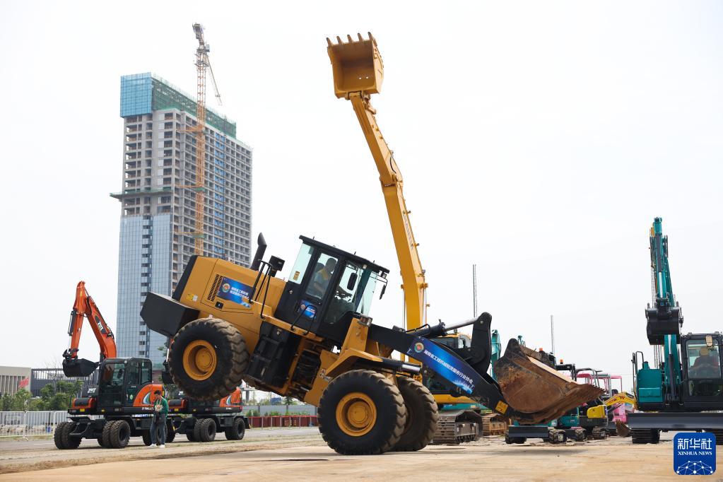 5月13日,在长沙国际工程机械展览会上,机手驾驶挖掘机“比心”。 在湖南长沙举办的第三届长沙国际工程机械展览会上,机手们驾驶挖掘机和装载机进行整机漂移、“空中漫步”等,并摆出各种造型、秀“舞技”。 新华社记者 薛宇舸 摄