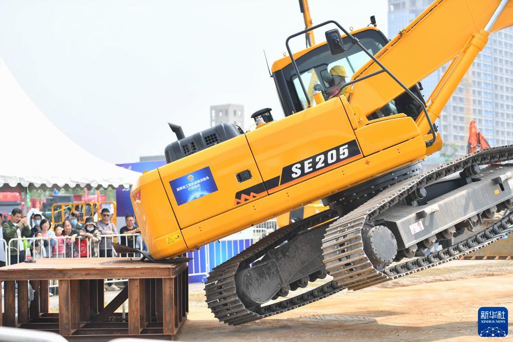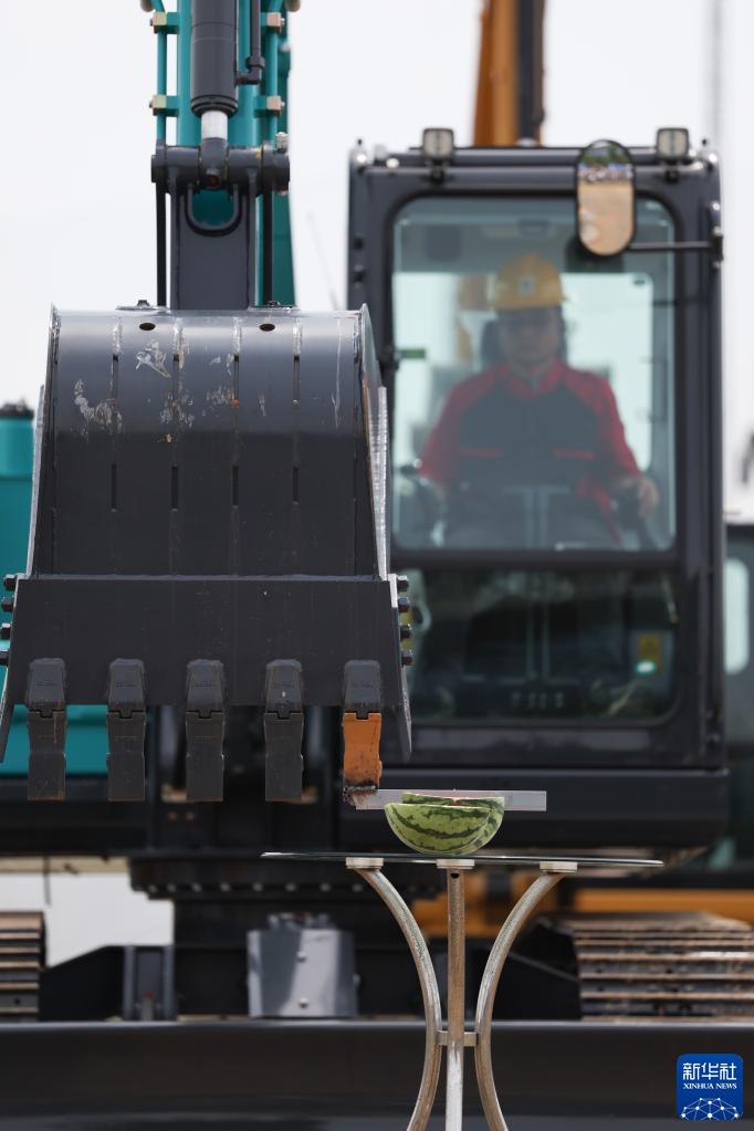 5月13日,在长沙国际工程机械展览会上,机手驾驶挖掘机切西瓜。 在湖南长沙举办的第三届长沙国际工程机械展览会上,机手们驾驶挖掘机和装载机进行整机漂移、“空中漫步”等,并摆出各种造型、秀“舞技”。 新华社记者 薛宇舸 摄
