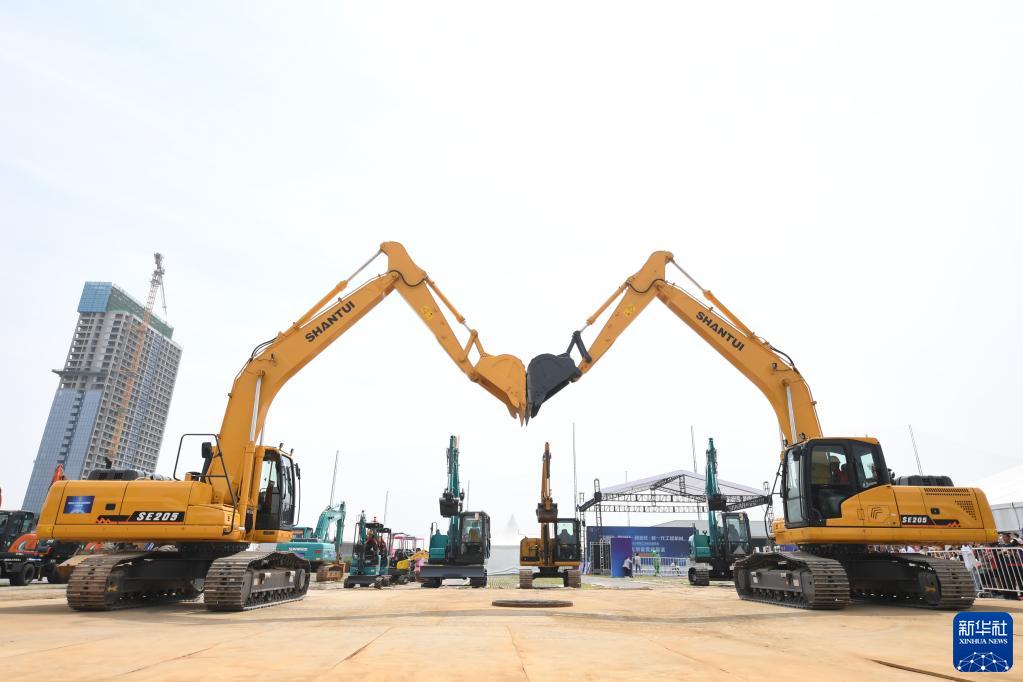 5月13日,在长沙国际工程机械展览会上,机手驾驶挖掘机“比心”。