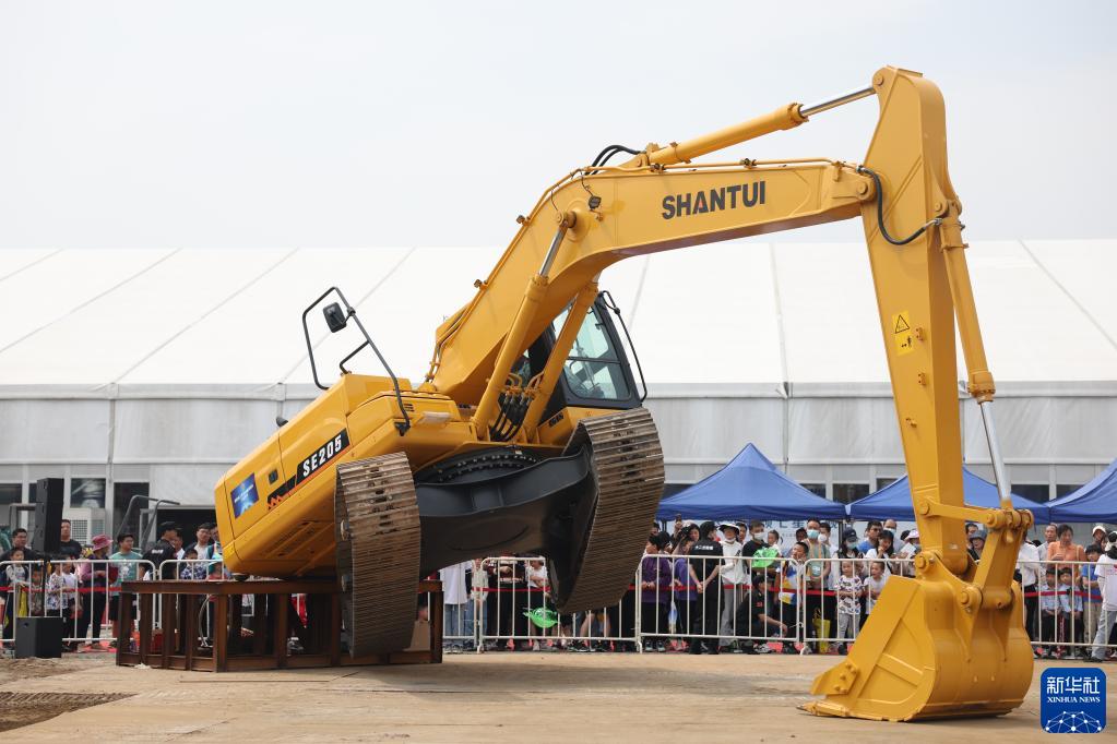 5月13日,在长沙国际工程机械展览会上,机手驾驶挖掘机表演。
