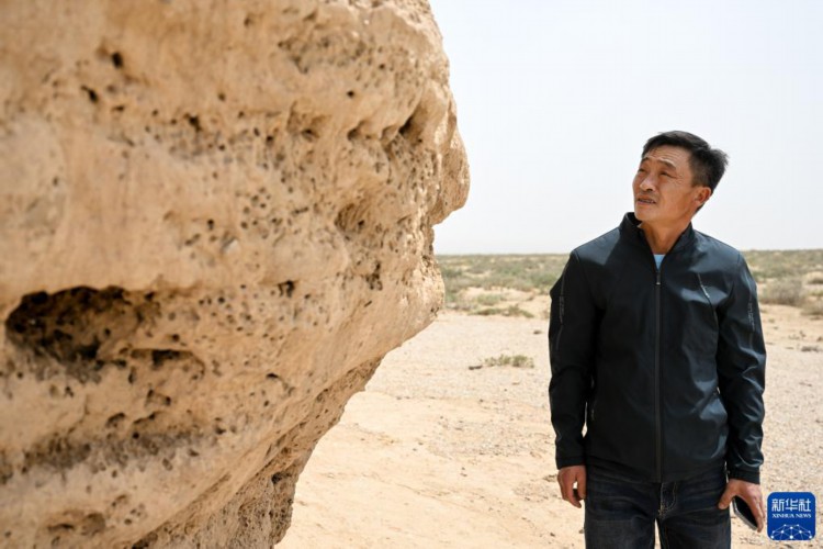 5月13日,驼峰(长城)文物保护队员布音乌力吉在观察阿拉善左旗一处烽火台遗址表面,查看是否有人为破坏痕迹。 内蒙古阿拉善盟地域辽阔,文物古迹点多面广,仅在阿拉善左旗境内就有403处不可移动文物点。为了进一步保护这些珍贵的文化遗产,2015年,阿拉善左旗8个苏木的41名牧民自发成立了驼峰(长城)文物保护队,队员们徒步或骑摩托车、骆驼到汽车难以到达的沙漠戈壁深处,巡查沙漠、戈壁地区重点文物古迹。 目前,该文物保护队已发展至44名队员,其中有3名国家级保护员。2021年,驼峰(长城)文物保护队被国家文物局评选为“最美文物安全守护人”。 新华社记者 贝赫 摄