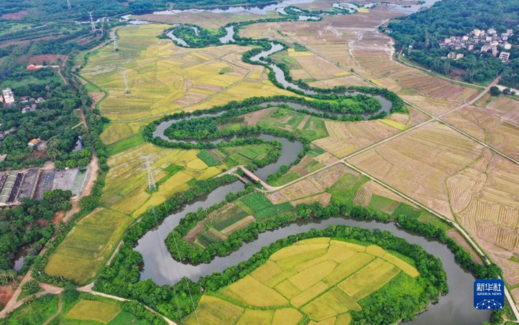 5月以来,位于海口市三十六曲溪两岸的水稻进入夏收时节,一片片成熟的稻田与蜿蜒曲折的河道交织,勾勒出一幅美丽的画卷。