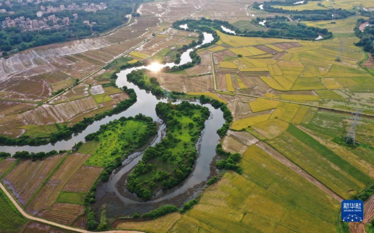 5月以来,位于海口市三十六曲溪两岸的水稻进入夏收时节,一片片成熟的稻田与蜿蜒曲折的河道交织,勾勒出一幅美丽的画卷。