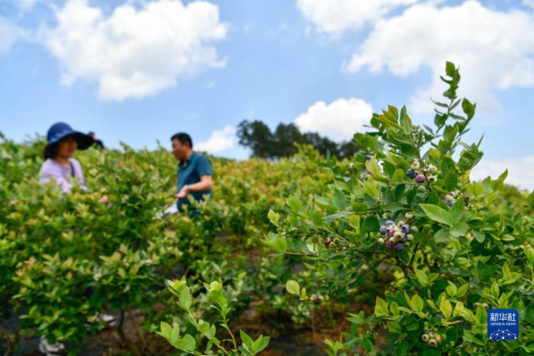 5月16日,在贵州省麻江县宣威镇翁保村,该县蓝莓产业发展服务中心的工作人员在采摘蓝莓。 目前,贵州省麻江县种植的8万余亩蓝莓陆续进入采摘期,各蓝莓种植基地开始采摘蓝莓鲜果,供应市场。麻江县于1999年开始栽培蓝莓,蓝莓已成为麻江“一县一业”主导产业,带动农民增收,助力乡村振兴。 新华社记者 杨文斌 摄