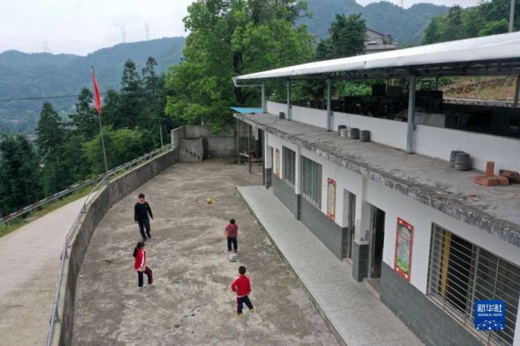 5月17日,在广西灵川县海洋乡中心岐教学点,蔡教宏和学生在课间做游戏(无人机照片)。