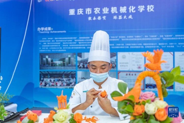 5月17日,在重庆市永川区举行的2023年成渝地区双城经济圈职业教育活动周办学成果展上,重庆市农业机械化学校学生崔志军在现场展示食品雕花技艺。 当日,2023年成渝地区双城经济圈职业教育活动周启动仪式在重庆市永川区举行,来自川渝两地近30所职业院校在办学成果展上展示了职业教育改革发展、产教融合等方面的成就。 此外,以永川国家高新区为基础,联合西部地区产业园区、企业、学校、科研机构共同组建的西部职教基地产教联合体也于当日在永川正式成立。据介绍,西部职教基地产教联合体是兼具人才培养、科技创新、促进产业发展等功能的市域产教联合体,将通过一系列实体化运行机制,在服务西部地区产业发展方面发挥重要作用。 新华社记者 黄伟 摄