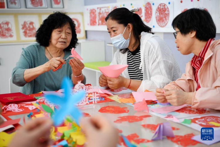 5月17日,老师(右二)向居民传授剪纸技艺。 当日,宁夏银川市首个职工非遗剪纸艺术培训基地在银川市新华街宝庆社区成立。据了解,由新华街街道工会打造的非遗剪纸艺术培训基地将定期邀请各级剪纸非遗传承人上门授课,为辖区居民打造家门口的“非遗课堂”,让居民能就近学习、感受中华传统剪纸技艺。 新华社记者 王鹏 摄