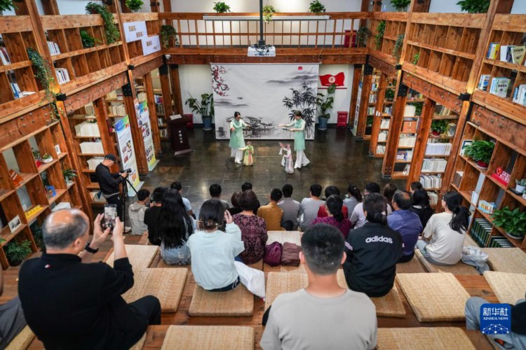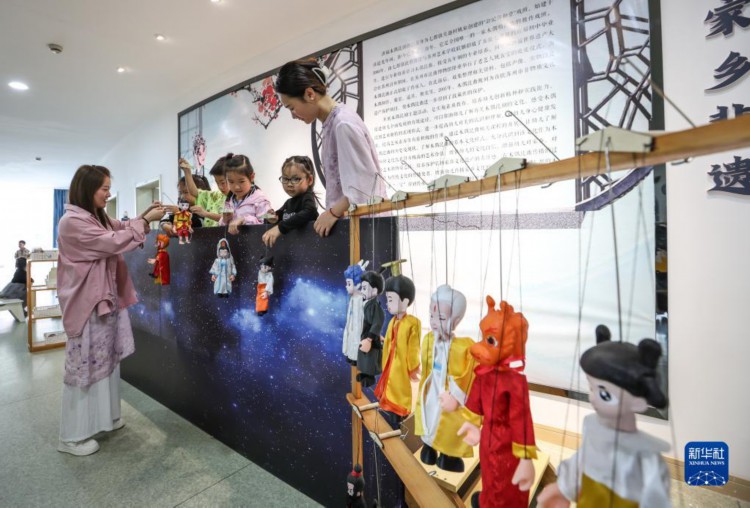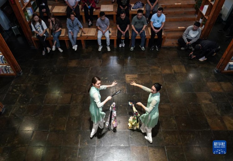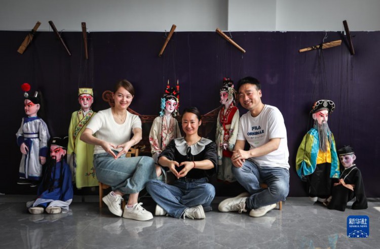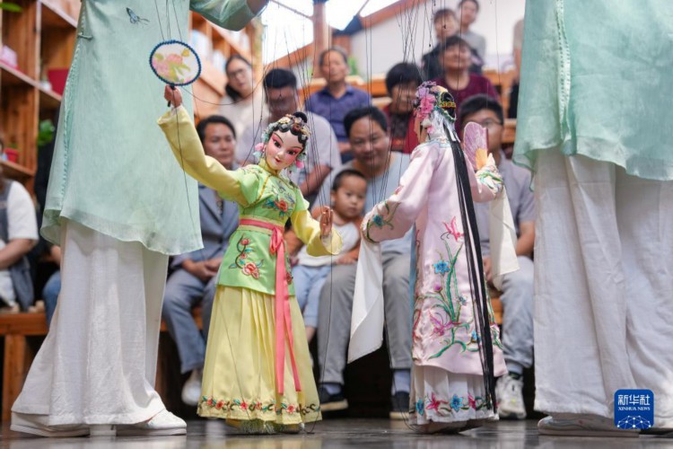 孙菁和施锦芳在七都镇江村文化礼堂表演昆曲木偶(5月17日摄)。 新华社记者 李博 摄