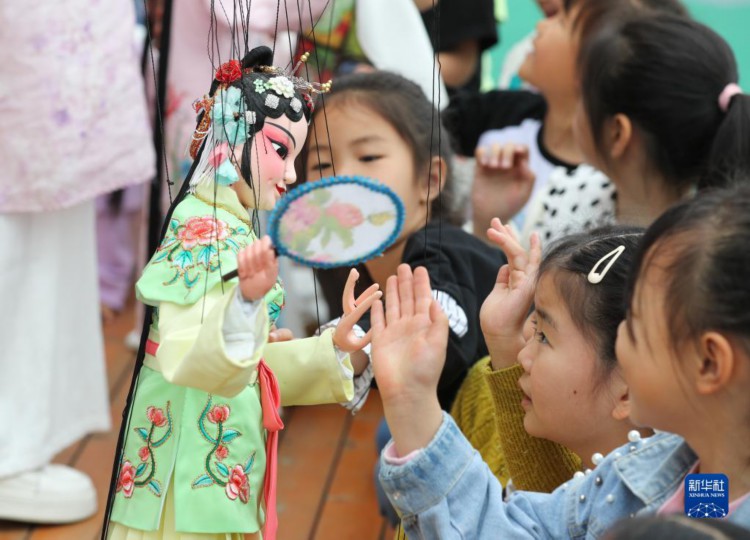在七都幼儿园,小朋友与提线木偶互动(4月20日摄)。 新华社记者 杨磊 摄