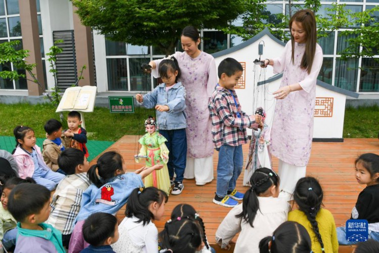 孙菁(右一)、施锦芳(左一)在七都幼儿园指导小朋友操作木偶(4月20日摄)。 新华社记者 杨磊 摄
