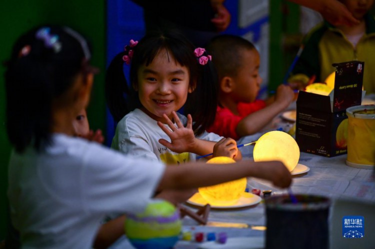 5月18日,小朋友在内蒙古博物院“博物馆之夜”活动中做手工。