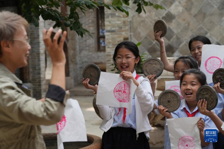 5月18日,小学生在河北省石家庄市新华区一家清代建筑博物馆体验瓦当拓片。