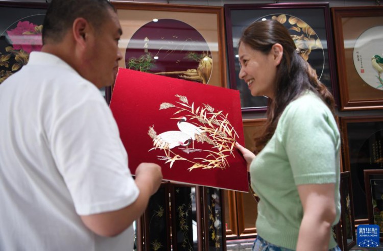 5月16日,谷穗(右)在门店里和丈夫葛磊讨论芦苇画。 初夏的风吹过,河南省周口市淮阳区龙湖里的丛丛芦苇随之摇曳。在淮阳区一家非遗传习基地,20岁的张富扬忙着将带有荷花图样的芦苇皮拼贴成片,他的左右手起起伏伏,灯光也随之忽明忽暗。他眼神专注、动作熟练,只有一旁的拐杖,才会让人注意到他腿部的异样。 这个传习基地,源自于“80后”谷穗和丈夫葛磊创办的金穗子芦苇工艺有限公司。谷穗的左臂轻微残疾。夫妻俩祖辈都是芦苇画手艺人,因此结缘后致力于非遗芦苇画的传习、生产、研发和销售。他们就地取材,以芦苇的叶、秆、花穗为原料,经过割、晒、晾、碾、贴等30多道工序精心制作成淮阳芦苇画。他们的作品经常参展并多次获奖。2021年,淮阳芦苇画被评选为河南省非物质文化遗产。 夫妻俩推行残疾人就业项目,每年拿出收入的20%作为传承经费,包吃包住免费向残疾人传授芦苇画手工技艺。据介绍,公司至今累计培训学员9000多人次,已发展成“国家级残疾人非遗传习基地”“国家级残疾人文化创意产业基地”。 除了照顾好传习基地的学员,夫妻俩目前还在琢磨着扩展芦苇画的底色,同时升级画框,让芦苇画适合更多风格的室内场景,扩大销路。 新华社记者 张浩然 摄