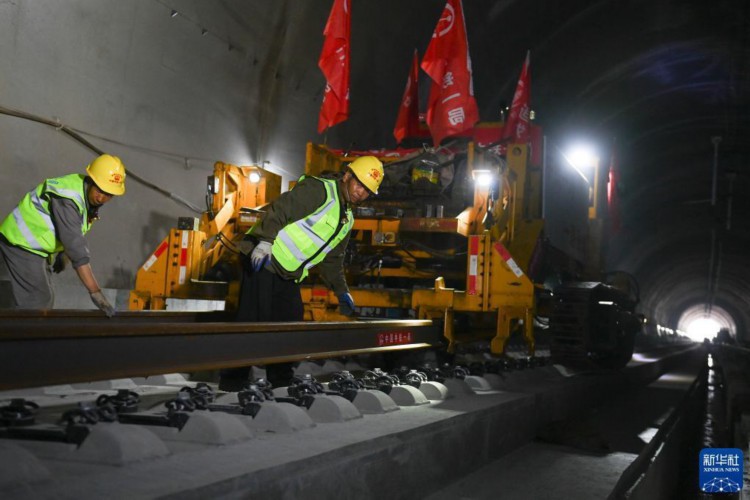 5月22日,中铁一局建设者在金甬铁路楼胜隧道内进行铺轨作业。