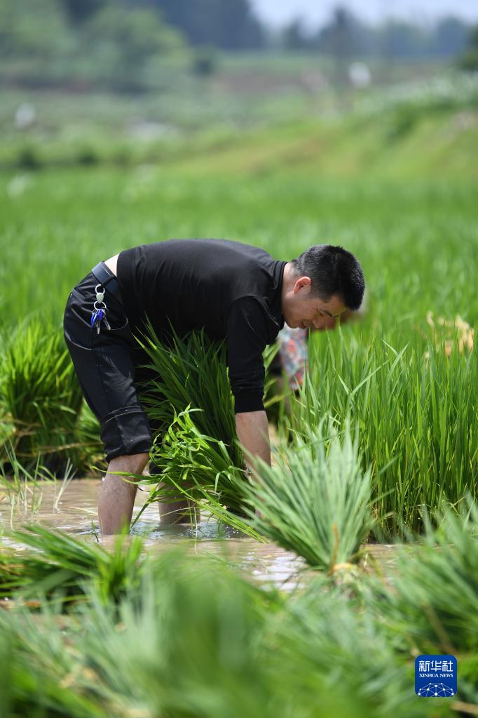 5月24日,在达州达川区大树镇,村民在田里劳作。 初夏时节,四川省达州市达川区农田郁郁葱葱,村民在田间劳作,构成一片绿意盎然的初夏田园景观。 近年来,四川省达州市达川区通过“整村整乡推进、集中连片打造”方式,推进区域内田型改造,建成高标准农田86.53万亩,2022年实现粮食年产量达53.7万吨。 新华社记者 胥冰洁 摄