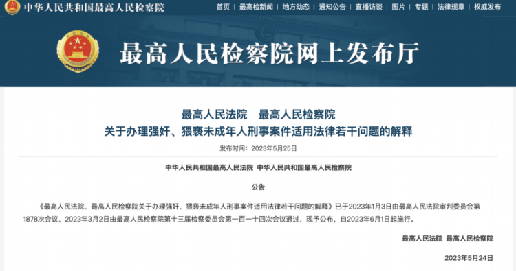 最高人民法院、最高人民检察院25日联合发布关于办理强奸、猥亵未成年人刑事案件适用法律若干问题的解释。最高人民法院、最高人民检察院、公安部、司法部联合发布关于办理性侵害未成年人刑事案件的意见。
