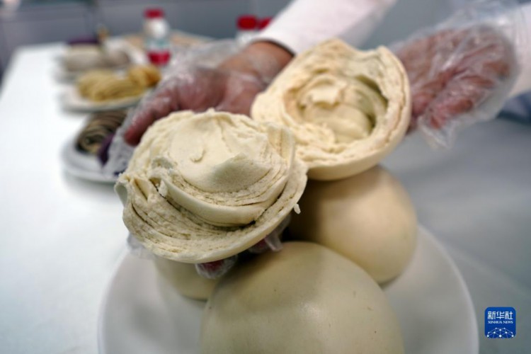 5月25日,在河北沧州渤海新区黄骅市一家农业科技公司产品展示厅,工作人员展示旱碱麦千层馒头。 近年来,河北沧州渤海新区黄骅市加大盐碱地改造提升力度,发挥科技创新作用,加强适宜盐碱地作物品种开发,推广旱碱麦种植产业化,利用旱碱麦籽粒饱满、富含微量元素、蛋白质含量高等特点,把小麦粉制作成面花等各种面食,拓展产业链下游市场,带动农民增收,促进农业发展。 目前,黄骅市旱碱麦总产量约13.26万吨,已经形成订单农业、收储中转、面粉加工、食品生产等功能集于一体的盐碱地特色农业产业链。 新华社记者 骆学峰 摄