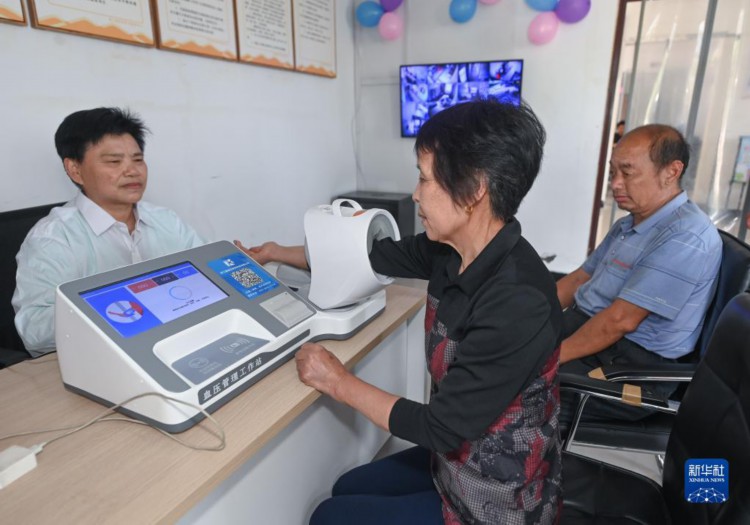 5月25日,在诸暨市姚江镇的镇级居家养老中心内,老人在测量血压。