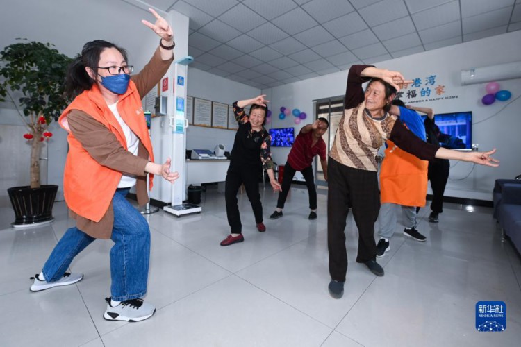 5月25日,在诸暨市姚江镇的镇级居家养老中心内,文化志愿者在教老人学习“五禽戏”。