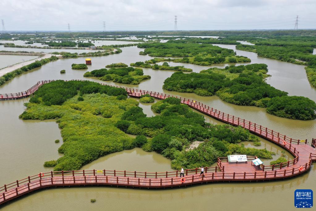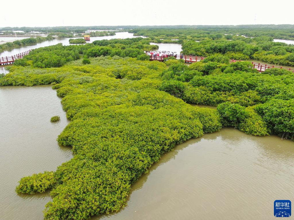 市民在位于湛江市的红树林国家级自然保护区金牛岛片区游览(5月25日摄)。 广东省湛江市蜿蜒绵长的海岸线上分布着大量红树林,占全国红树林总面积的33%。“红树林之城”湛江坚持绿色发展,保护红树林,展现生态和谐之美。 新华社记者 刘大伟 摄