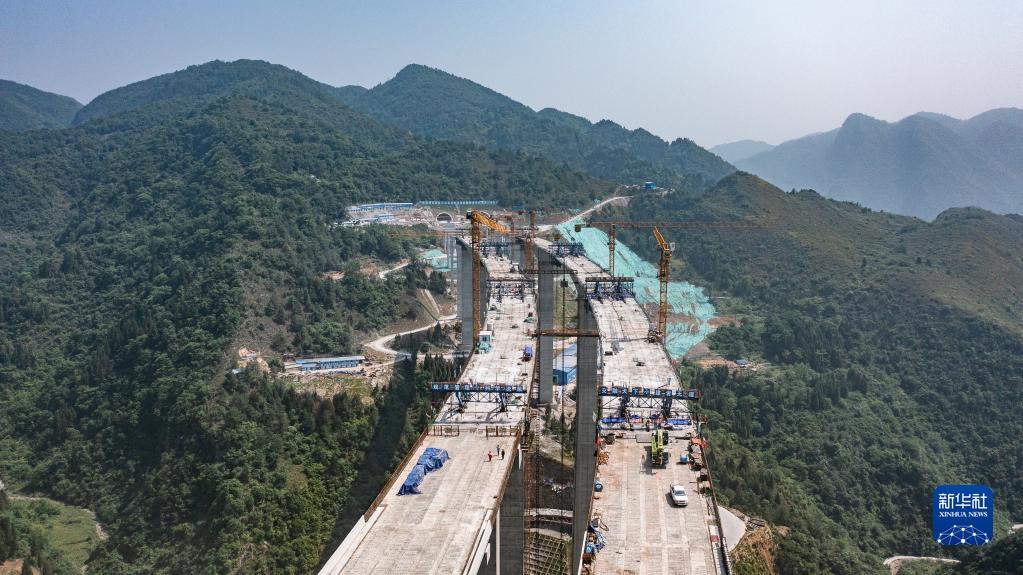 5月27日拍摄的贵金古高速清池特大桥主桥连续刚构合龙现场(无人机照片)。
